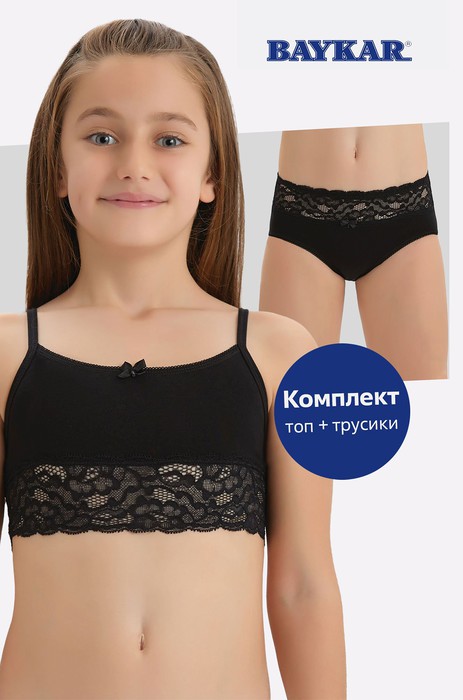 Нежный однотонный комплект белья для девочки и девочки подростка выполнен из натурального хлопка с эластаном. Бельевой комплект черного цвета комфортно носить под любую одежду круглый год. В наборе майка топ для девочек и трусы в черном цвете. Комплект украшен эластичным и кружевом.