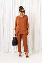 Удобные зауженные брюки из лёгкой ткани, со льном в составе. Брюки свободного прилегания по бедрам, в пояс вставлена эластичная тесьма с кулисой и втянутым шнурком. Вход в карман фигурный, наклонный к боковому шву. По низу брюк оформлены подвороты.