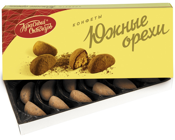 Коробка конфет «Южные орехи» от фабрики «Красный Октябрь» – будто сладкий привет из далекой экзотической страны. Аккуратные полумесяцы «орехов» с помадно-марципановой начинкой покрыты плотной шоколадной глазурью и щедро припорошены какао. Нежная, чуть вязкая текстура начинки с пьянящим привкусом коньяка и миндального ореха прекрасно гармонирует с насыщенной терпкостью пушистой какао-пудры и глазури.