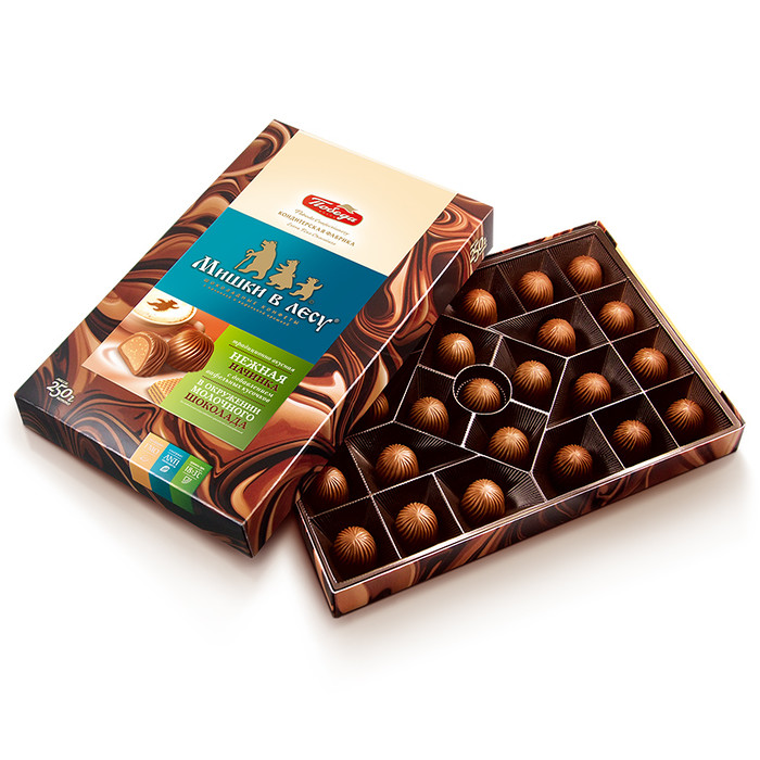 Конфеты «Мишки в лесу» на протяжении нескольких поколений являются символом семейного праздника и уютного чаепития в кругу самых близких. Рецепт этих шоколадных конфет от "Победы" – это насыщенная молочно-шоколадная начинка с хрустящим криспом в оболочке из нежного молочного шоколада.