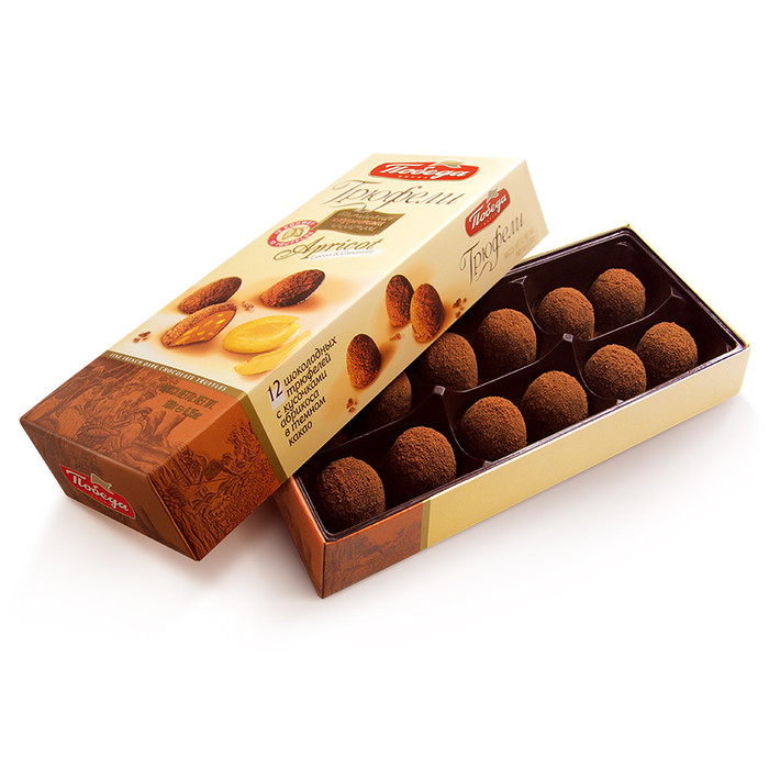Классические трюфели «Победа» созданы по традиционному рецепту. Нежное «сердце» из сливок и шоколада усыпано ароматным темным какао. В этом рецепте в ганаш добавлены кусочки абрикоса, которые создают изящный вкусовой альянс – фруктовой кислинки в обрамлении терпкого шоколада.