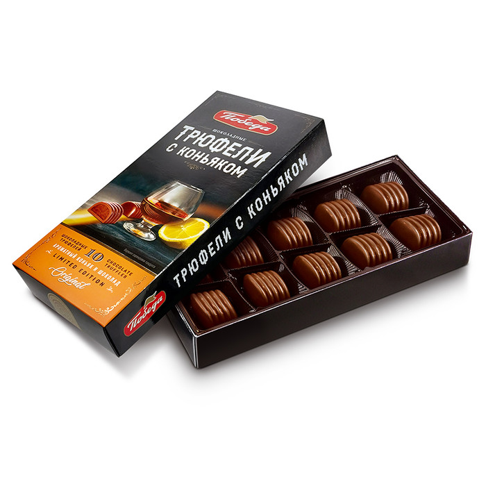 Об аристократичном. Шоколад – прекрасный «спутник» коньяка, а также арманьяка, рома и кальвадоса. Сочетать крепкий алкоголь и шоколад придумали французы. Трюфели с коньяком от «Победы» – нежное трюфельное «сердце» из сливок и шоколада с согревающим послевкусием капельки коньяка.