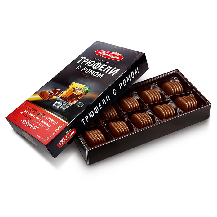 Об аристократичном. Шоколад – классический в кондитерском искусстве «спутник» коньяка, а также арманьяка и ликеров. Конфеты с алкоголем - это два удовольствия в одном. Трюфель с ромом от «Победы» – это нежное трюфельное «сердце» или Ganache из сливок и шоколада, пропитанное ромом, в окружении нежной оболочки из сливочного шоколада. Вкус конфеты раскрывается постепенно: согревающее терпкое ощущение начинки перекликается с насыщенным шоколадным послевкусием.