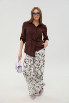 Костюм женский из кулирного полотна состоит из кофты и брюк. Кофта прямого силуэта с двойным капюшоном, люверсами и шнуром. Рукав короткий, втачной, по низу изделия пояс, на полочке принт. Брюки прямые с лампасами из отделочного полотна, верх на поясе с резинкой, низ изделия обработан на плоскошовной машине.