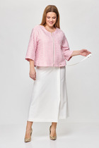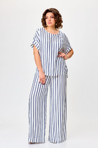 Костюм женский из кулирного полотна состоит из футболки и брюк. Футболка - прямой силуэт, горловина круглая, рукав короткий, втачной, низ изделия обработан на плоскошовной машине, на полочке принт. Брюки прямые, верх на поясе с резинкой, в боковых швах внутренние карманы, низ изделия на манжете.