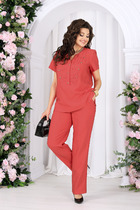 Костюм женский состоит из блузы-футболки и леггинсов. Футболка с коротким рукавом, спинка удлинена, рукава и низ декорированы манжетой и серебристой ткани. Леггинсы удлиненные, со сборкой по низу.
