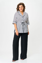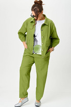 Костюм с брюками, спортивного типа. По бокам брюк лампасы молочного цвета. Брюки с карманами, в пояс вдет шнурок. По низу брюк черные манжеты с принтом. Кофта приталенного силуэта, по низу и на рукавах черные манжеты с принтом. Горловина обработана окантовкой.