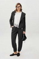 Описание Костюм состоящий из джемпера и брюк. Джемпер прямого силуэта из трикотажного полотна. Воротник - широкая стойка. Горловина с застежкой на петлю и пуговицу. Рукав одношовный втачной, чуть спущена линия плеча. По низу джемпера в боковых швах разрезы. Обращаем ваше внимание, что фурнитура может отличаться от фото. Брюки прямого силуэта из трикотажного полотна. По верху брюк притачной пояс, по переду застежка молния в среднем шве, карманы в боковых швах и декоративные складки. На задних половинках брюк прорезные листочки. По задним половинкам брюк на поясе резинка от вытачки до вытачки. Обращаем ваше внимание, что фурнитура может отличаться от фото.