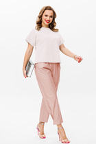 Комплект состоит из майки и шорт. Шорты в спортивном стиле с фигурным низом, облегающие, короткие, на поясе. Майка на бретелях, полуприлегающего силуэта, со вставками из отделочного полотна на полочке, с удлиненной спинкой. Горловина, бретели, низ шорт обработан бейкой из основного полотна.