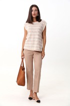 Костюм юбочный,сочетание полоски и трикотажа создает шикарный образ как для работы,отдыха,так и для повседневной жизни.джемпер женский выполнен из премиум трикотажа, свободного силуэта,с V-образным вырезом горловины, со спущеным плечом, рукава 7/8. По полочке серебрянная дизайнерская печать, по низу серебрянная вставка. Спинка со средним швом. Горловина обработана бейкой.Юбка женская асиметричного кроя, из классической костюмной полоски, по переду пояс вставка сошлёвками, по спинке пояс с эластичной резинкой.