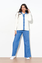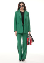 Роскошный брючный костюм, состоит из жакета и брюк. Жакет двубортный, прямого силуэта, выполнен из премиальной костюмной ткани с добавлением вискозы. Жакет полностью на премиальной подкладке, с застежкой по переду на пуговицы и функциональными карманами с клапаном. Рукав втачной, полной длины, по низу декорирован пришивными пуговицами. Брюки прямые, на поясе с резинкой и застежкой на пуговицу и молнию, в боковых швах с функциональными карманами.