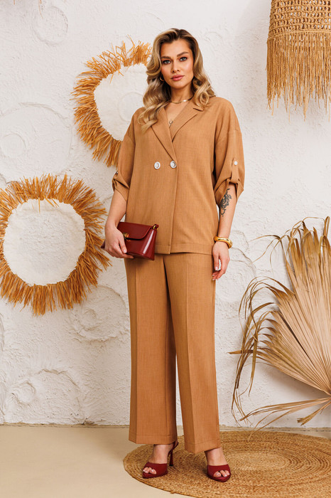 Стильный женский комплект, состоит из жакета прямого силуэта и брюк. Жакет выполнен из костюмной ткани с добавлением льна, хлопка и вискозы, со спущенной проймой, что придает свободу движению и комфорта при носке. Жакет модного дизайна, двубортный с одним рядом крупных пуговиц, что придает модели особый шарм. Рукав 3/4, с застежкой на пату и декорирован пуговицей меньшего размера, при желании рукав можно удлинить, расстегнув пуговицу. Брюки прямые, выполнен из костюмной ткани с добавлением льна, хлопка и вискозы, на поясе с резинкой и застежкой на пуговицу и молнию. Модель костюма стильная и практичная, отлично подойдет для ежедневной носки.