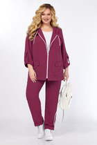 Комплект женский двухпредметный, состоит из жакета и юбки. Жакет слегка притален, удлиненный, с центральной застежкой на 1 петлю и пуговицу, с воротником пиджачного типа. Низ бортов прямой. По переду бочек и функциональные карманы с клапаном. Спинка со средним швом без особенностей. Рукава втачные, двухшовные декорированные пуговицами и шлицей. Юбка прямая длиной миди из ткани с геометрическим рисунком из ткани жаккардового переплетения. По заднему полотнищу юбки шов с застежкой потайная молния и разрезом по низу. Для максимально комфортной посадки по бокам пояса вставлена эластичная резинка. Длина жакета 68 см, длина рукава 60 см, длина юбки 89 см.
