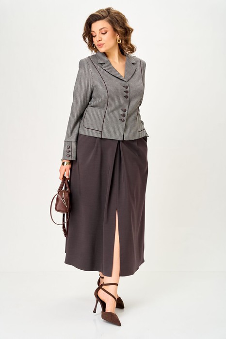 Костюм построен на контрасте фактур и цветов: строгая чёрно-белая «гусиная лапка» + глубокий графитово-коричневый низ. Коричневая отстрочка-кант на жакете выступает связующим звеном между верхом и низом, создавая единую цветовую историю. Рельефы и приталенный силуэт делают фигуру визуально стройнее и выше. Рукав втачной двухшовный с широкой манжетой и пуговицами. Юбка на подкладке. Для максимально комфортной посадки по бокам пояса вставлена эластичная резинка. Сочетание мягкого верха и строгого низа создаёт баланс между комфортом и аккуратностью, делая комплект универсальным для офиса, повседневных выходов и стильных деловых встреч.