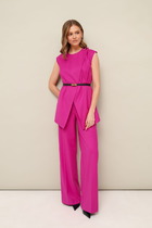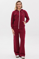 Костюм в стиле спорт-шик сочетающий в себе  женственность и  комфорт. Сочетание двух тканей трикотажного полотна и костюмной ткани добавляет оригинальность. Жакет со спущеным плечем и  декорирован печатью по левой части переда, воротник пиджачного типа.  По пинии плеча паты с полукольцом. Рукав втачной одношовный с манжетой по низу.  Спинка с кокеткой и отлетной планкой. Понизу довяз и регулируемая кулиса. Брюки, слегка зауженные к низу, свободного силуэта. По переду вблизи боковых швов карманы. Для максимально комфортной посадки по поясу вставлена эластичная резинка.