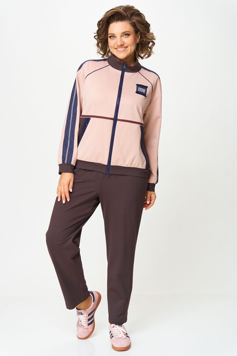 Этот стильный спортивный костюм из двух предметов сочетает в себе практичность и современный дизайн, идеально подходящий для активного образа жизни или повседневной носки. Комплект включает бомбер на молнии и брюки, выполненные в гармоничной цветовой палитре.  Бомбер прямого силуэта с центральной застежкой-молнией, выполнен из мягкого трикотажного материала. Основной цвет — нежно-розовый с контрастными вставками темно-синего и шоколадного оттенка на рукавах и груди. Рукава украшены декоративными полосами, а на левой стороне груди расположен  декоративный элемент с напечатанным логотипом для акцента. Манжеты и нижний край с резинкой обеспечивают плотную посадку, внутренняя подкладка отсутствует.