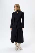 Юбка-брюки прямого силуэта, с притачным поясом на резинке: юбка по переду с мягкой складкой смещённой влево, по левому боковому с разрезом, декорированный отделочной тесьмой, правый боковой отлетной, брюки по боковым швам с разрезами (выполнены из трик. полотна).