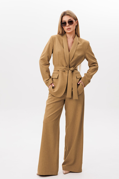 Жакет прилегающего силуэта с воротником "Шаль". По переду действующие прорезные карманы с клапаном. Рукав втачной двухшовный. По низу рукава отлетная шлица. Жакет на подкладке, с поясом из основной ткани. Застежка на петлю пуговицу.