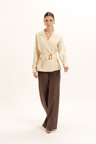 Жакет свободного силуэта с застежкой по переду на кнопки. Воротник отложной. По переду отрезные кокетки, накладные карманы с клапанами. По спинке кокетка и рельефы. Рукав двухшовный с притачной манжетой на кнопках. Низ жакета на притачном поясе.