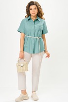 Брюки прямого силуэта с эмитацией запаха на притачном поясе. По переду застежка на тесьму-молнию. По боковым действующие карманы.