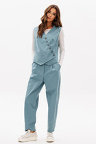 Жакет свободного силуэта с застежкой по переду на кнопки. Воротник отложной. По переду отрезные кокетки, накладные карманы с клапанами. По спинке кокетка и рельефы. Рукав двухшовный с притачной манжетой на кнопках. Низ жакета на притачном поясе.