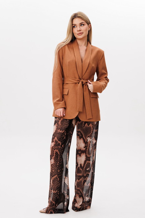 Жакет прилегающего силуэта с воротником "Шаль". По переду действующие прорезные карманы с клапаном. Рукав втачной двухшовный. По низу рукава отлетная шлица. Жакет на подкладке с поясом из основной ткани. Застежка на петлю пуговицу.