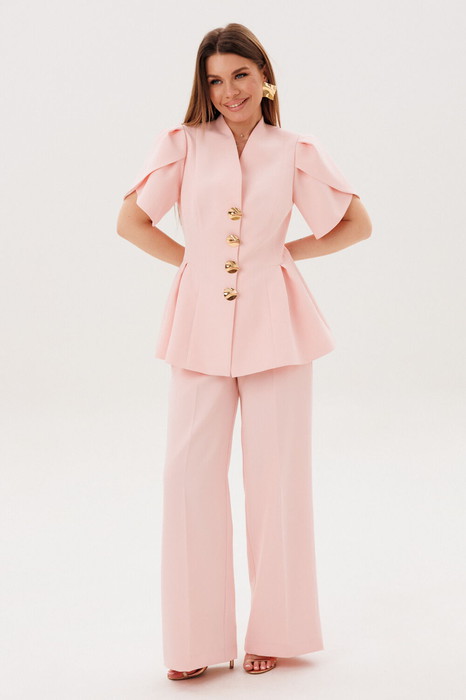 Жакет на подкладке, по переду застежка на металлические пуговицы, рукав"фонарик". По низу жакета баска.