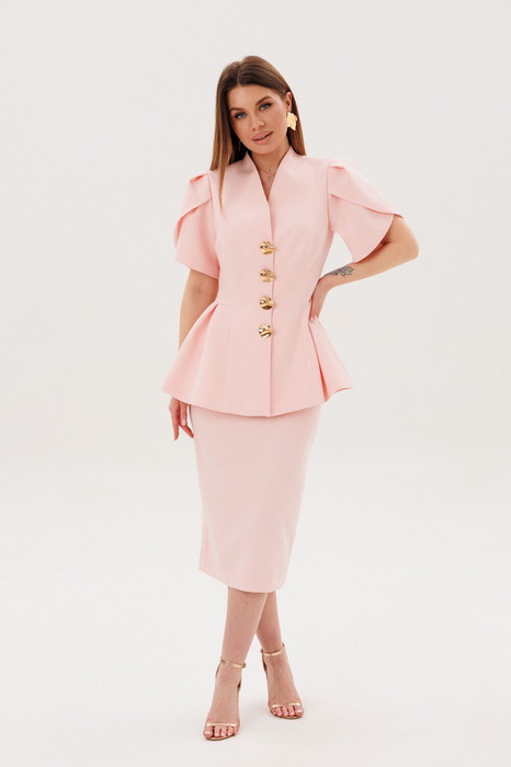 Жакет на подкладке, по переду застежка на металлические пуговицы, рукав"фонарик". По низу жакета баска.