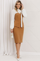 Юбка-карандаш прилегающего силуэта. Задняя часть юбки со средним швом. В среднем шве застежка на потайную тесьму молнию. По низу разрез.