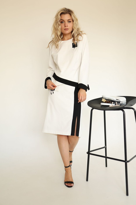 Трикотажный костюм с контрастной отделкой . Застежка по спинке на молнию. Юбка на подкладке.