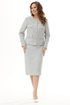 Костюм женский с брюками выполнен из костюмной ткани. Жакет полуприлегающего силуэта на подкладке, по полочке обработаны рельефные швы и в области талии прорезной карман листочка. Воротник пиджачного типа, застежка центральная на петли и пуговицы. Спинка со средним швом и рельефами. Рукав втачной двухшовный в локтевом шве рукава обработана имитация шлицы с пуговицами. Брюки прямого силуэта, верхний срез брюк на притачном поясе с эластичной тесьмой, в боковых швах карман с отрезным бочком.