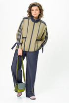 Костюм женский состоящий из жакета и прямых брюк, зауженных к низу. Жакет прямого силуэта с воротником пиджачного типа и центральной застежкой на петли и пуговицы. По полочке обработана кокетка, в шов которой вставлен отделочный клапан. В шве рельефа обработан карман. Рукав втачной, двухшовный. Спинка со средним швом и рельефами. Верхний срез обработан притачным поясом по задним половинкам для лучшей посадки вставлена резинка, застегивающийся на петлю и пуговицу, застёжка центральна с гульфиком и откоском на тесьму молнию, в боковых швах обработаны функциональные карманы с отрезным бочком. Костюм дополнен съёмным поясом из основной ткани застегивающийся на пряжку-протяжку.