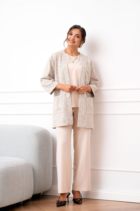 Костюм женский тройка, состоящий из облегчённого жакета, блузки и брюк. Жакет удлинённый выполнен из трикотажа букле прямого силуэта, линия плеча слега спущена, рукав длинной 7/8. Застежка центральная на притачных планках, по полочке в области бёдер обработаны накладные карманы.