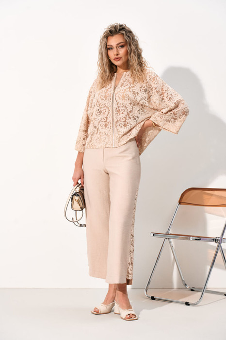 Костюм женский состоящий из бомбера и брюк. Брюки прямого силуэта выполнены из смесового волокна льна и вискозы благодаря чему отлично садятся по фигуре и обеспечивают износостойкость с отделкой в боковом шве из гипюра. В среднем шве обработана застежка на тесьму-молнию, верхний срез обработан притачным поясом с шлёвками для ремня, по спинке вставлена резинка что обеспечивает идеальную посадку на любую талию.