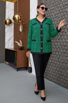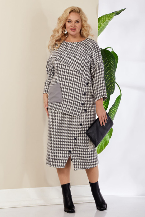 Комплект женский 2-х предмеиный ( блузка, юбка) из текстилькой ткани. Блуза прямого силуэта со спущенным плечом, низ по полочке фигурный, симметричный. По полочке идет кокетка в виде подреза, отделка в виде пуговиц и накладной карман (из эко-кожи). По спинке средний шов, рукав 3/4 длины. Юбка зауженная к низу, по полочке идет ассемитричный подрез с пуговицами. По спинке средний шов, шлица , пояс отрезной с резинкой. Длина блузы (по спинке):(50-54)- 59см, (56-60)-62 см. Длина рукава: (50-60)-33см. Длина юбки: (50-60):-73см.