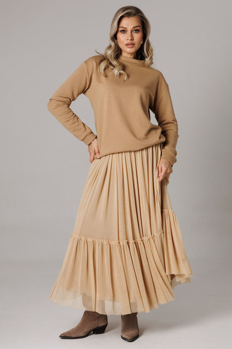 Оригинальный женский комплект от бренда Anastasia, идеальный для любого случая. Этот костюм сочетает в себе элегантность и комфорт, что делает его подходящим как для повседневной носки, так и для праздничных мероприятий. Джемпер оверсайз из трикотажного полотна. Прямого силуэта со спущенным плечом. Воротник-стойка. По рукаву идет подрез с разрезом. Низ рукава и низ джемпера - на манжете. Джемпер лекго сочетается с любыми низами: брюки, джинсы, юбка. Юбка макси из 2-х видов ткани: верх с отрезным валаном из стрейчевой сетки, подкладка юбка солце из шифона. Пояс на декоративной резинке. Фасон универсален, а использование резинки на поясе повышает комфортность носки, позволяя юбке адаптироваться под индивидуальные особенности фигуры. Юбку легко сочетать с различными верхами: топ, блузка, футболка, кружевной жакет, свитер или жакет из тексиля - все это позволит создавать различные образы на разные случаи. Длина по спинке 68см. Длина рукава (с манжетой): 60см. Длина юбки: 90 см
