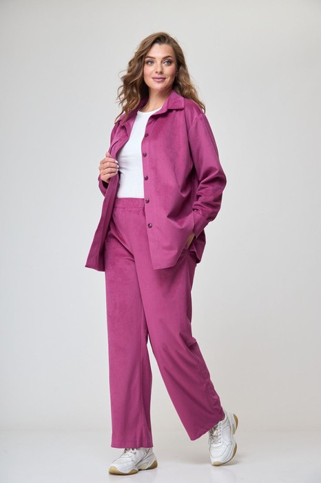 Костюм из вельвета, супер комфортный и уникальный. Рубашка прямая, с разрезами по боковым швам, длиной до бедра. Рукав длинный, с манжетами. Классический рубашечный воротник, застежка по переду на петли пуговицы. По переду справа нагрудный карман.