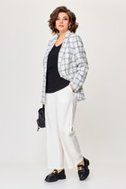 Брюки с высокой посадкой, длинные, расширенные к низу. По переду боковые карманы и застежка на гульфик с молнией. Пояс от бокового шва по спинке на резинке, по переду застежка на петлю пуговицу. При помощи съемного пояса можно дополнительно подчеркнуть талию, как в брюках, так и в жакете.