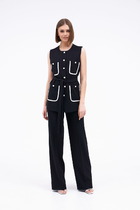 Брюки с высокой посадкой прекрасно дополняют жакет. Они длинные и расширяются к низу, что придает им элегантность и стиль. Передняя часть брюк оснащена боковыми карманами, а застежка выполнена на гульфике с молнией. Пояс находится от бокового шва по спинке и имеет резинку для комфорта, а передняя часть закрывается петлей и пуговицей.