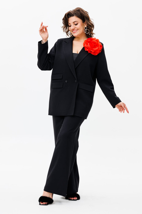Прямой двухбортный жакет, брюки на резинке по спинке и с карманами.