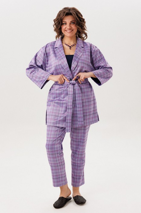 Костюм из утеплённого трикотажного полотна, выполненный в цвете «лавандовая история» с классическим клетчатым принтом. Этот актуальный предмет гардероба обладает вневременной притягательностью, оставаясь стильным независимо от сменяющихся тенденций.