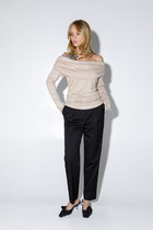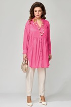 Брюки широкие длинные, с заутюженными стрелками, с высокой посадкой. На передних половинках складки. Пояс притачной с застежкой на молнию, петли и пуговицы, со вставками эластичной тесьмы по бокам. В боковых швах расположены карманы с косым входом.