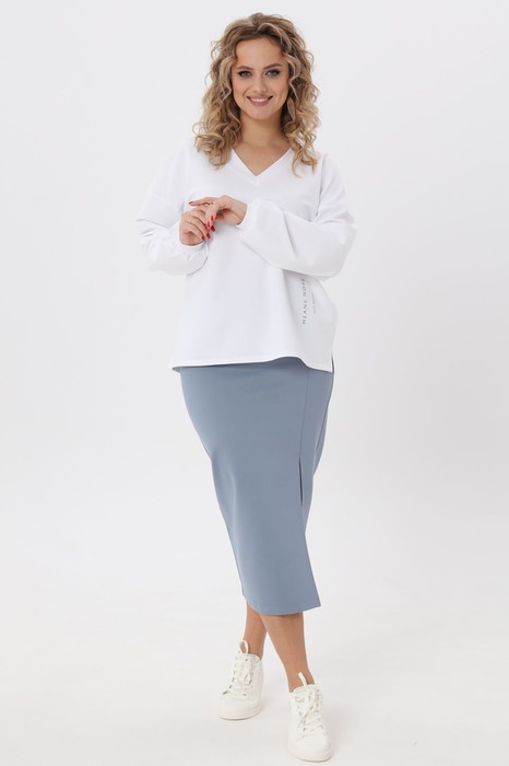 Джемпер прямого силуэта с разрезами в боковых швах. V-образный вырез горловины удлинит шею и визуально вытянет силуэт. Рукав втачной длинный со спущенной линией плеча, по низу рукава сборка и притачная манжета. По переду выполнена декоративная надпись.