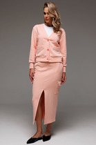 Комплект выполнен из плотной ткани состоит из жакета и шорт. Характеристики жакет: укороченный, подкладка, подплечники, застежка центральная смещенная вниз, рукав втчаной, остроугольный лацкан, прорезное кармашек по переду жакета, спинка цельнокроеная;