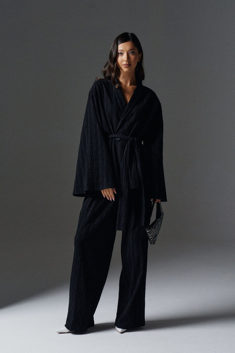 Комплект состоит из жакета и брюк выполнен из фактурного полотна черного цвета. Жакет прямого свободного кроя, подкладка, отложной воротник, застежка центральная на петли пуговицы, в боковых швах шлевки, в комплекте пояс из ткани основного изделия, рукав с разведением к низу - спущен. Длина по спинке 68 см, длина рукава 78 см от края горловины. Брюки прямого кроя, пояс на брендированной резинке, в боковых швах карманы. Длина брюк 112 см.