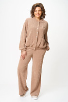 Комплект состоит из рубашки и брюк выполнен из фактурного розового полотна. Характеристики: рубашка прямого, ассиметричного кроя, спинка в изделии короче, отложной воротник, застежка центральная на петли пуговицы, по переду крупный карман, рукав спущен, по низу рукава манжета, по переду изделие с плавным срезом. Длина по спинке 48 см, длина по передней части 61 см, длина рукава от края горловины 78 см. Брюки прямого кроя, пояс на резинке с кулиской, в боковых швах карманы. Длина брюк 99 см.