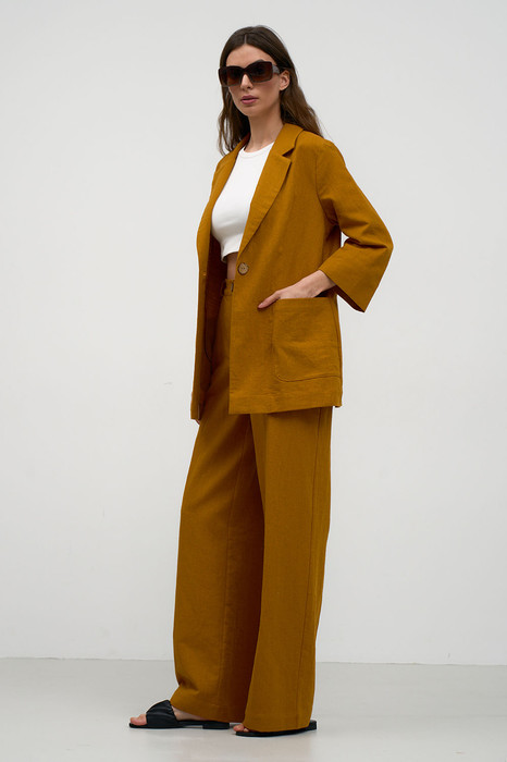 Льяной костюм насыщенного яркого цвета из льяной ткани станет прекрасным выбором для летнего лука.. Жакет прямого силуэта. На переде обработаны накладные карманы. Рукав двухшовный, втачной. Воротник пиджачный. Застежка центральная на петли и пуговицы. Брюки свободного силуэта с карманами в боковых швах и вытачками на задних половинках. Возможно отличие фотографии по оттенку, связанное с разной цветопередачей монитора.