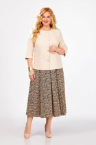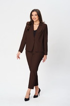 Костюм 2-предметный: жакет и брюки. Двубортный жакет на подкладке, прямого силуэта. Обработаны прорезные карманы по переду. Рукава втачные одношовные, обработаны шлицей.  Брюки прямого кроя, длинна 7/8, застёжка- гульфик , по юоковым вам обработаны карманы