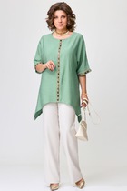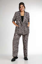 Жакет однобортный свободнго силуэта. Жакет обработан подкладкой. Рукав прямой, длинный, втачной, отрезной с пришитой присборенной деталью, шнурком из основной ткани для завязывания. Брюки классические, по форме прямые, клешенные от лиии колена, застежка - потайная молния. Съёмный пояс из основной ткани, обработан пряжкой - в комплекте