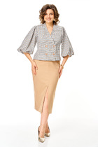 Этот 3-х предметный комплект состоит из жакета, корсетного топа и брюк. Жакет - настоящая жечужина в гардеробе. Небанальный вариант застёжки сбоку на лицевой стороне, и потайной пуговицей внутри изделия придаёт жакету характер, подчёркивает силуэт и линию талии. Жакет выгодно акцентирует фигуру, создавая утончённый и женственный образ. Благодаря декоративным рюшам из вуали, он легко станет центральным элементом образа. Карманы с клапанами. Корсетный топ с открытыми плечами — воплощение чувственной элегантности. Открытые плечи подчеркивают линию шеи и ключиц, а корсетный крой создает безупречный силуэт. Роскошный силуэт и акцентная баска делают его идеальным выбором для особенного вечера. Также топ отлично вписывается в повседневные образы. Брюки станут глотком свежего воздуха среди широких силуэтов и брюк палаццо. Их облегающий крой подчёркивает линию бедёр и тали, а затем изящно расклешается от колена.Такой фасон позволит скорректировать фигуру и подойдёт для строго дресс кода. Вертикальные линии по центру брючин вытягивают силуэт и удлиняют ноги. Застёжка классическая - молния и пуговица в цвет изделия.